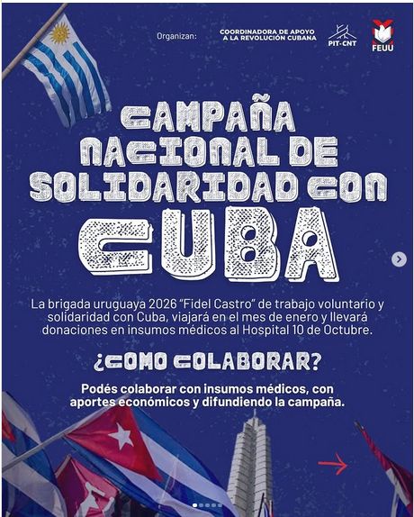 La Brigada Uruguaya "Fidel Castro 2026", la Coordinadora de Apoyo a la Revolución Cubana, el Pit-Cnt y la FEUU viajará a Cuba en enero de 2026. Las donaciones pueden realizarse en la sede de la central obrera hasta el mes de diciembre de 2025 -Jackson 1283-, aportando medicamentos vigentes, suturas, materiales hospitalarios, herramientas de mantenimiento y aportes económicos. También, bonos solidarios de $100.