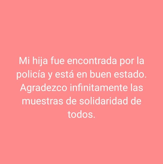 En la presente jornada la propia escritora informó a través de Facebook que su hija había sido hallada "en buen estado" por la Policía, al tiempo que agradeció "las muestras de solidaridad" brindadas por la población.