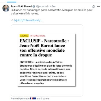 El funcionario francés afirmó que "Francia está inundada por el narcotráfico" - crédito @jnbarrot/X