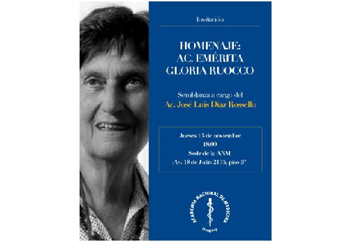 MONTEVIDEO (Uypress) - La Academia Nacional de Medicina invita para un homenaje recordatorio de la Academica Emerita Prof. Dra. Gloria Ruocco a realizarse el jueves 13 de noviembre de 2025 a las 18 horas, en su sede de 18 de Julio 2175 5to Piso.