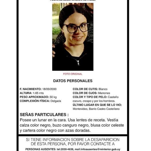 La joven tiene 25 años, mide 1,65 metros y su peso aproximado es de 50 kilogramos. Tiene ojos marrones, pelo castaño y cutis blanco. La última vez que se la vio fue en Montevideo, en el barrio Castro Castellano.