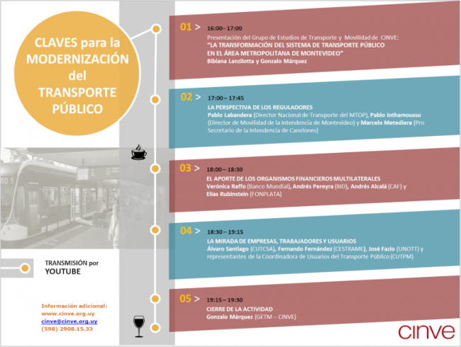 MONTEVIDEO (Uypress)- El próximo 5 de diciembre a las 16:00 hs. el Grupo de Estudios de Transporte y Movilidad de CINVE presentará públicamente en el Centro Cultural Verde los avances del proyecto en curso sobre «Transformación del Transporte Público en el Área Metropolitana de Montevideo».