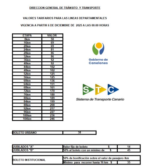 CANELONES (Uypress) - La Dirección General de Tránsito y Transporte del Gobierno de Canelones comunica las tarifas actualizadas de boletos de las líneas departamentales que empieza a regir a partir de las 00:00 horas del 6 de diciembre.