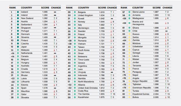 Según da cuenta el documento, los tres países más seguros de todo el mundo son Islandia, que encabeza la lista, con una puntuación de 1.095; Irlanda, con 1.260 puntos; y Nueva Zelanda en tercer lugar, con una puntuación de 1.282.