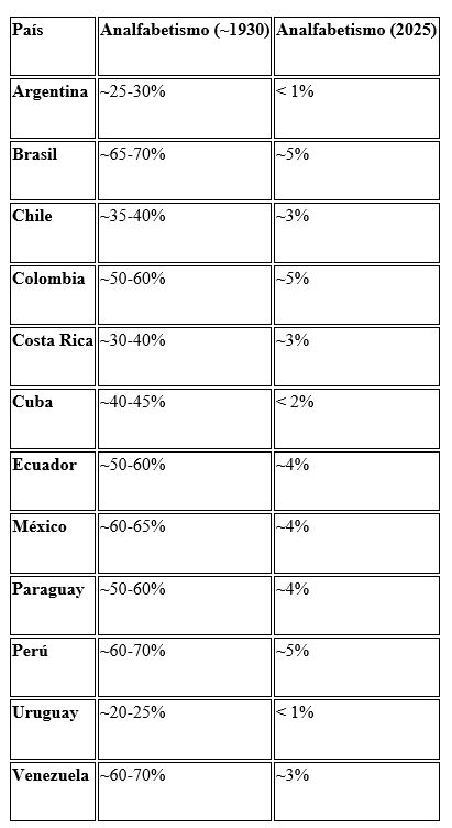 La siguiente tabla refleja la transformación educativa de la región. El dato de 1930 es una estimación promedio del período basada en reconstrucciones históricas, mientras que el de 2025 proviene de proyecciones basadas en informes de la UNESCO y organismos nacionales.