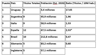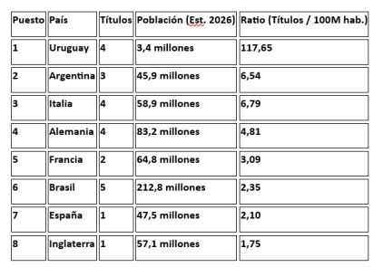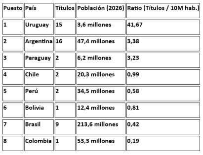 Uruguay es el líder indiscutible: Con 15 títulos y una población reducida, su ratio de 41,67 títulos por cada 10 millones de habitantes es estadísticamente abrumador. Es, por amplio margen, el país más eficaz del continente en la obtención de este trofeo en relación con su escala demográfica.