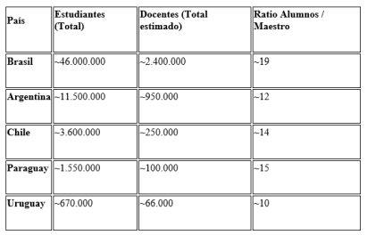 Es importante tener en cuenta que los datos provienen de fuentes oficiales y censos escolares de cada país. La categoría de "docentes" puede variar ligeramente entre países según incluyan personal administrativo o solo docentes frente a grupo, por lo que estas cifras deben entenderse como una aproximación a la escala del sistema.