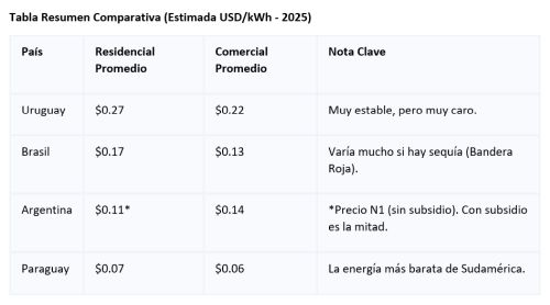 Análisis comparativo de los precios de la energía eléctrica en la región, basado en los datos más recientes de 2025 y las estructuras tarifarias vigentes.