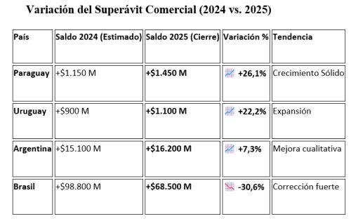 Fue un año extraordinario para el comercio exterior del bloque. Argentina lideró la tabla con un rebote espectacular impulsado por la energía y el campo, mientras que Paraguay y Uruguay consolidaron sus industrias clave. Brasil, aunque creció menos en porcentaje (porque su base ya es gigante), rompió récords absolutos de volumen.