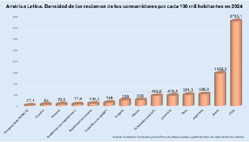Los datos indican que, entre 2022 y 2024, los reclamos aumentaron en 10 agencias de protección al consumidor, con alzas que van desde el 4,5% (Perú) hasta el 65,8% (El Salvador) y disminuyeron en 5 países, destacando reducciones entre el -5,1% en Argentina hasta el -21,5% en Uruguay.