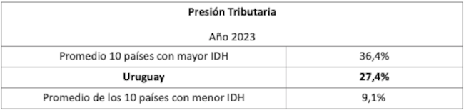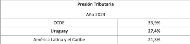 De un total de 97 países para los que la OCDE reporta su presión tributaria para el año 2023, Uruguay con un valor del 27,4%, se encuentra a mitad de camino, en el lugar 37. El valor mayor corresponde a Francia con una presión tributaria del 43,8%, y el menor valor a Bangladesh con 7,3%.