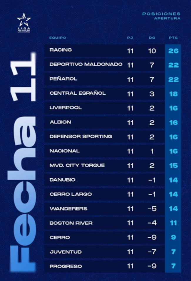 La derrota alejó a Peñarol del líder, Racing, que con su triunfo de este domingo ante Wanderers llegó a 26 puntos. Los dirigidos por Aguirre quedaron con 22 (al igual que Deportivo Maldonado). Con cuatro fechas y 12 unidades por jugar, el equipo tiene una ventaja de cuatro sobre sus escoltas.