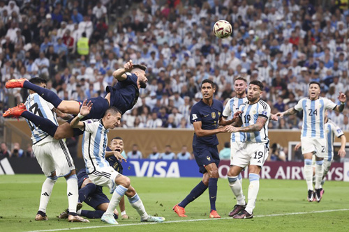 Olivier Giroud (arriba), de Francia, compite durante el partido correspondiente a la final entre Argentina y Francia en la Copa Mundial de la FIFA 2022, en el Estadio Lusail, en Lusail, Qatar, el 18 de diciembre de 2022. (Xinhua/Lan Hongguang)
