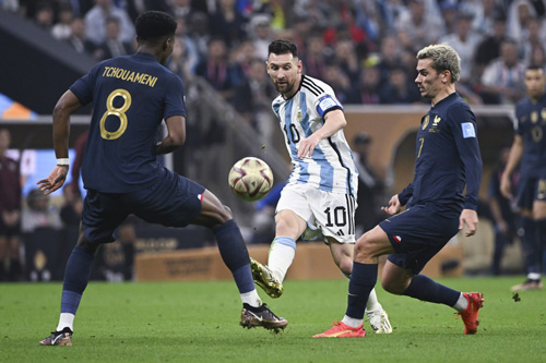 Lionel Messi (c), de Argentina, pasa el balón durante el partido correspondiente a la final entre Argentina y Francia en la Copa Mundial de la FIFA 2022, en el Estadio Lusail, en Lusail, Qatar, el 18 de diciembre de 2022. (Xinhua/Li Ga)
