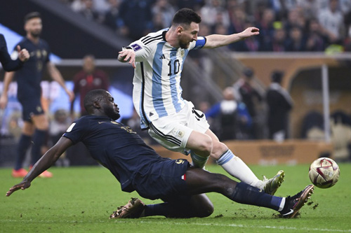 Lionel Messi (arriba), de Argentina, disputa el balón con Dayot Upamecano, de Francia, durante el partido correspondiente a la final entre Argentina y Francia en la Copa Mundial de la FIFA 2022, en el Estadio Lusail, en Lusail, Qatar, el 18 de diciembre de 2022. (Xinhua/Li Ga)