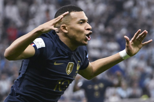 Kylian Mbappe (d), de Francia, festeja su anotación de tiro penal durante el partido correspondiente a la final entre Argentina y Francia en la Copa Mundial de la FIFA 2022, en el Estadio Lusail, en Lusail, Qatar, el 18 de diciembre de 2022. (Xinhua/Cao Can)