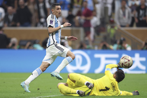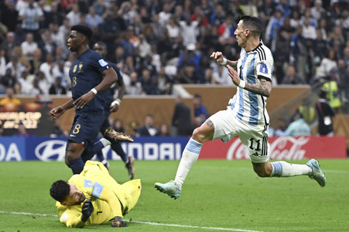 Angel di Maria (i), de Argentina, anota el segundo gol del equipo durante el partido correspondiente a la final entre Argentina y Francia en la Copa Mundial de la FIFA 2022, en el Estadio Lusail, en Lusail, Qatar, el 18 de diciembre de 2022. (Xinhua/Li Ming)