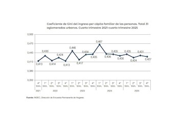 El informe oficial, basado en la Encuesta Permanente de Hogares (EPH), indica que el coeficiente de Gini del ingreso per cápita familiar de las personas fue de 0,427 en el cuarto trimestre de 2025, frente a los 0,431 del trimestre previo y a los 0,430 en igual período de 2024. El Gini, utilizado internacionalmente para medir la desigualdad, refleja que un valor más bajo supone una distribución de ingresos menos desigual.