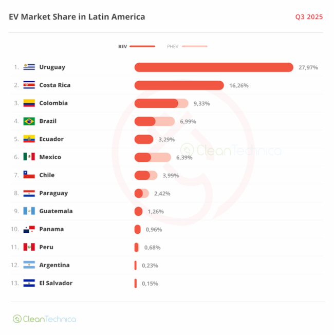 De acuerdo a la publicación, que consigna el portal Ambito, Uruguay es el líder indiscutido de la región con el 27,97% respecto a la penetración del mercado, seguido por Costa Rica, que cuenta con el 16,26%. Ambos países representan una cuota de mercado 100 veces superior a la de mercados más rezagados como Argentina y El Salvador. En tanto el país vecino, sigue siendo el único mercado mediano sin una electrificación significativa.