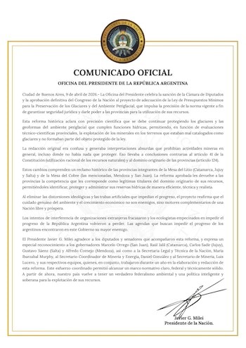 Durante la madrugada, Javier Milei festejó la victoria a través de sus redes sociales y por medio de un comunicado de Oficina de Presidencia destacó que "celebra la sanción de la Cámara de Diputados y la aprobación definitiva del Congreso de la Nación al proyecto de adecuación de la Ley de Presupuestos Mínimos para la Preservación de los Glaciares y del Ambiente Periglacial, que impulsa la precisión de la norma vigente a fin de garantizar seguridad jurídica y darle poder a las provincias para la utilización de sus recursos".