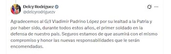 "Agradecemos al G/J Vladimir Padrino López por su entrega, su lealtad a la Patria y por haber sido, durante todos estos años, el primer soldado en la defensa de nuestro país", expresó Rodríguez en sus redes sociales.