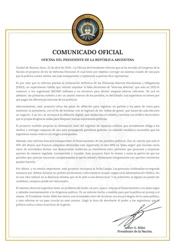 Ayer, el propio Milei anticipó en sus redes sociales que enviarían el proyecto y dijo: "ELIMINAMOS LAS PASO: basta de obligar a los argentinos a pagar internas de la casta. CAMBIAMOS EL FINANCIAMIENTO: se termina la política viviendo de tu bolsillo. FICHA LIMPIA: los corruptos AFUERA para siempre. SE ACABÓ LA IMPUNIDAD. SE ACABÓ LA JODA. VIVA LA LIBERTAD CARAJO...!!".