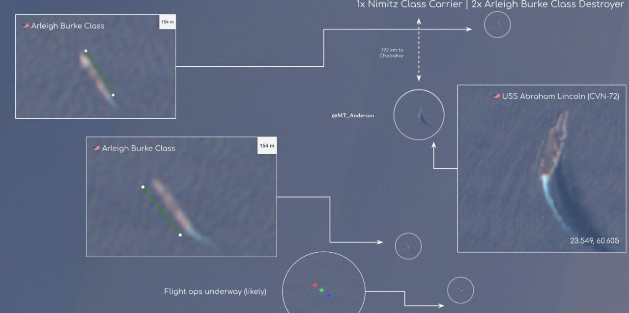 El portaaviones estadounidense USS Abraham Lincoln (CVN-72) se encuentra actualmente a una distancia aproximada de entre 250 y 300 kilómetros de la costa de Irán. Resulta llamativo que la Armada estadounidense haya decidido, por algún motivo, arriesgar el buque, cuyo coste total, junto con su ala aérea, asciende a unos 12-14 mil millones de dólares. El fundamento de esta confianza no está del todo claro, ya que Irán aún posee una importante reserva de misiles antibuque. Al parecer, el mando de la Armada estadounidense confía en que la Guardia Revolucionaria Islámica no se arriesgará a utilizar estos misiles.