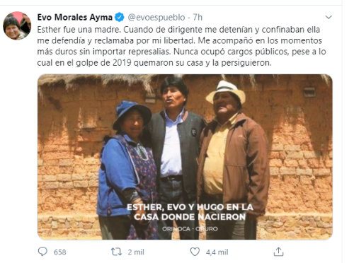 "Acompaño en estos momentos de profundo dolor a toda la familia Morales, a mi cuñado Ponciano Willcarani, a mis sobrinos y nietos ante el fallecimiento de Esther, que fue una madre para todos. Mis condolencias. Que en paz descanse", expresó Evo Morales, actualmente radicado en Argentina.