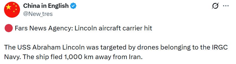 Del Tehran Times:Portavoz del Cuartel General Central Khatam al-Anbiya (cuartel general de coordinación militar de Irán):El USS Abraham Lincoln fue atacado por las fuerzas navales de la Guardia Revolucionaria Islámica y quedó inutilizado.La aerolínea ha abandonado la región y actualmente está regresando a los Estados Unidos.