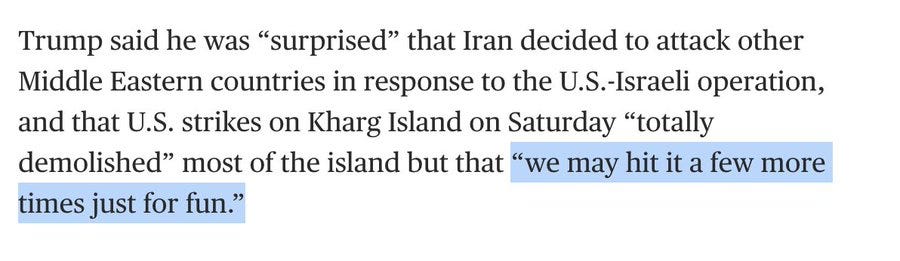 Un ejemplo emblemático de la total falta de rumbo de la fallida operación es la nueva declaración de Trump en una entrevista con NBC. Tras afirmar que la isla de Kharg fue "totalmente destruida" -a pesar de los informes verificados por los principales medios de comunicación que indican que Irán continúa enviando petróleo allí como de costumbre-, Trump comenta con indiferencia que podría atacar la isla de nuevo "solo por diversión".