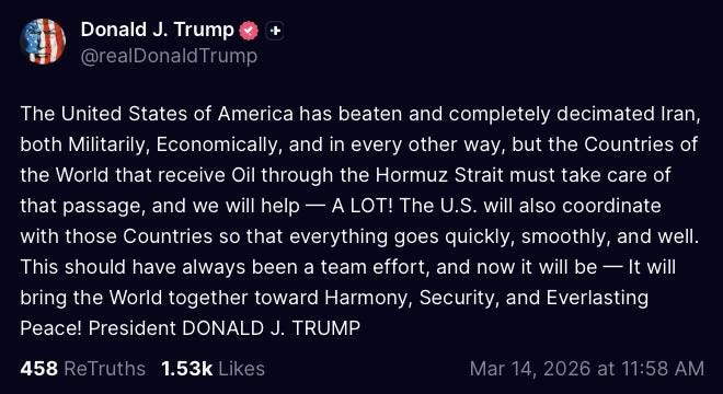 Como señala el comandante de la Armada iraní, Trump está prácticamente suplicando a sus aliados que desbloqueen el estrecho, culpándolos de su cierre después de que Estados Unidos "diezmara" milagrosamente a todo Irán.