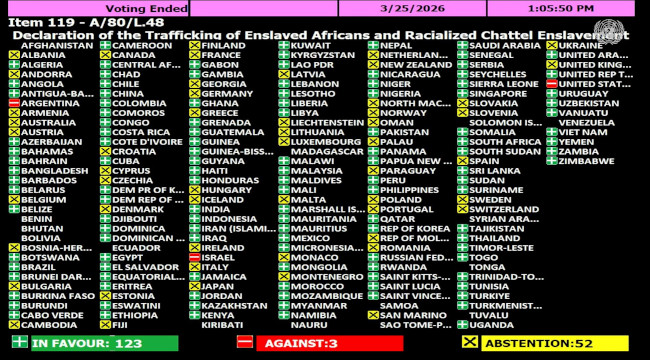 NUEVA YORK (Uypress)- La Asamblea General aprobó la resolución con 123 votos a favor y 52 abstenciones, dejando aislados a los tres países que rechazaron calificar la esclavitud como el crimen más grave de la historia.