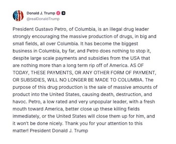 Con estas afirmaciones, el jefe de Estado norteamericano profundizó lo que había adelantado en Truth Social, la red social en la que comunica sus decisiones, en la que no dudó en calificar al primer mandatario como un "líder del narcotráfico", que -como lo indicó desde su avión presidencial, sin titubeos- "incentiva la producción masiva de drogas, tanto en campos grandes como pequeños, por toda Colombia".