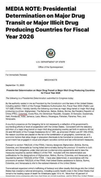 El 15 de setiembre, Estados Unidos había anunciado la descertificación de Colombia, aunque sin perder en ese momento los millonarios montos de cooperación - crédito Departamento de Estado de Estados Unidos