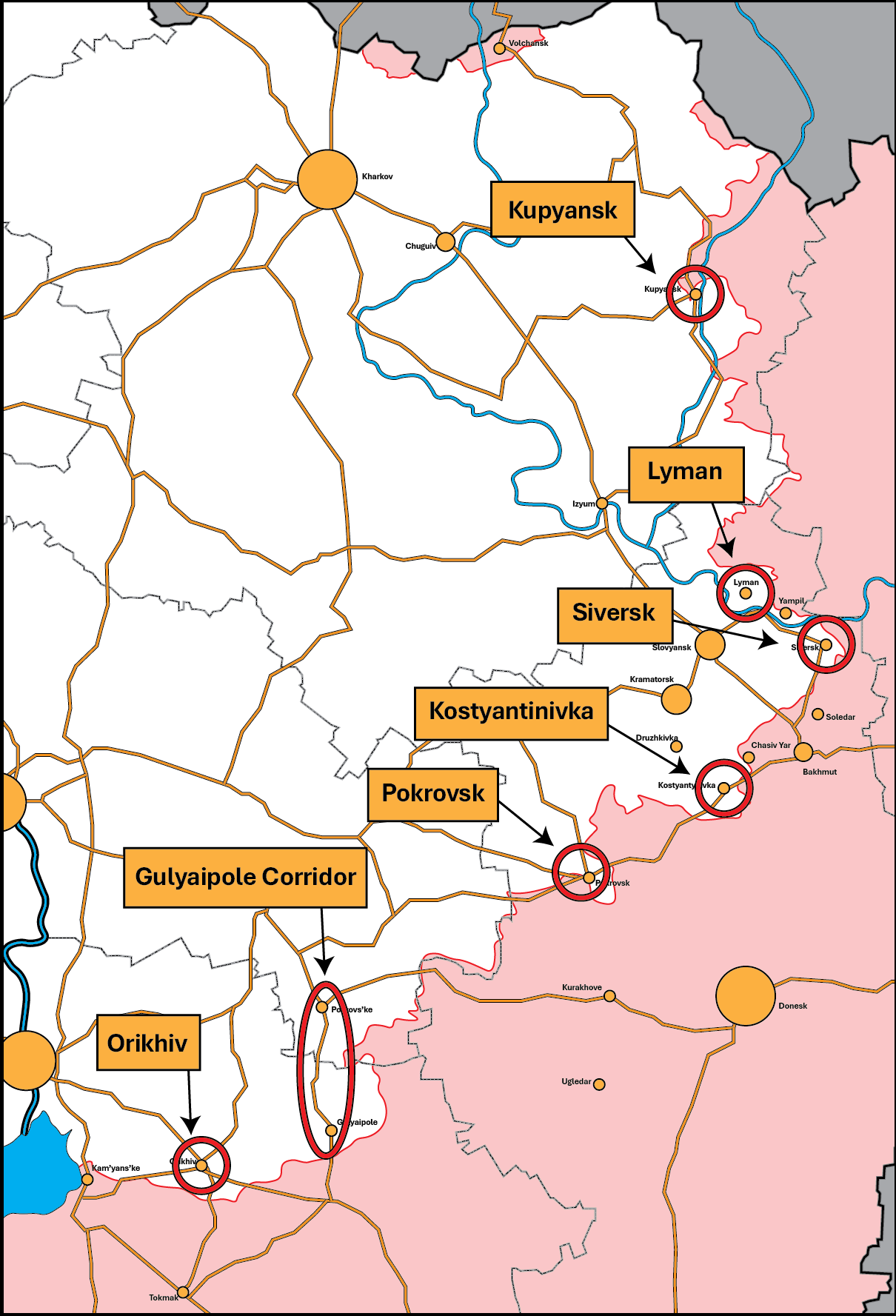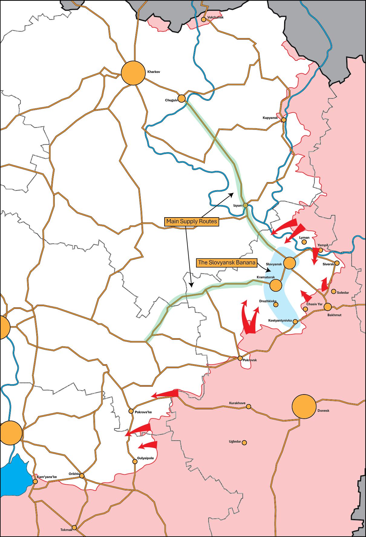 El segundo hecho importante sobre el río Banana es que, a pesar de su tamaño, cuenta con el apoyo de solo dos autopistas que se aproximan desde el suroeste y el noroeste, respectivamente, y se adentran en él como una cuña. Tomando como ejemplo la autopista del norte/MSR (la E40), vemos que las operaciones rusas en la curva del Donets no son esfuerzos secundarios: son operaciones vitales de configuración vinculadas a la integridad del río Banana.
