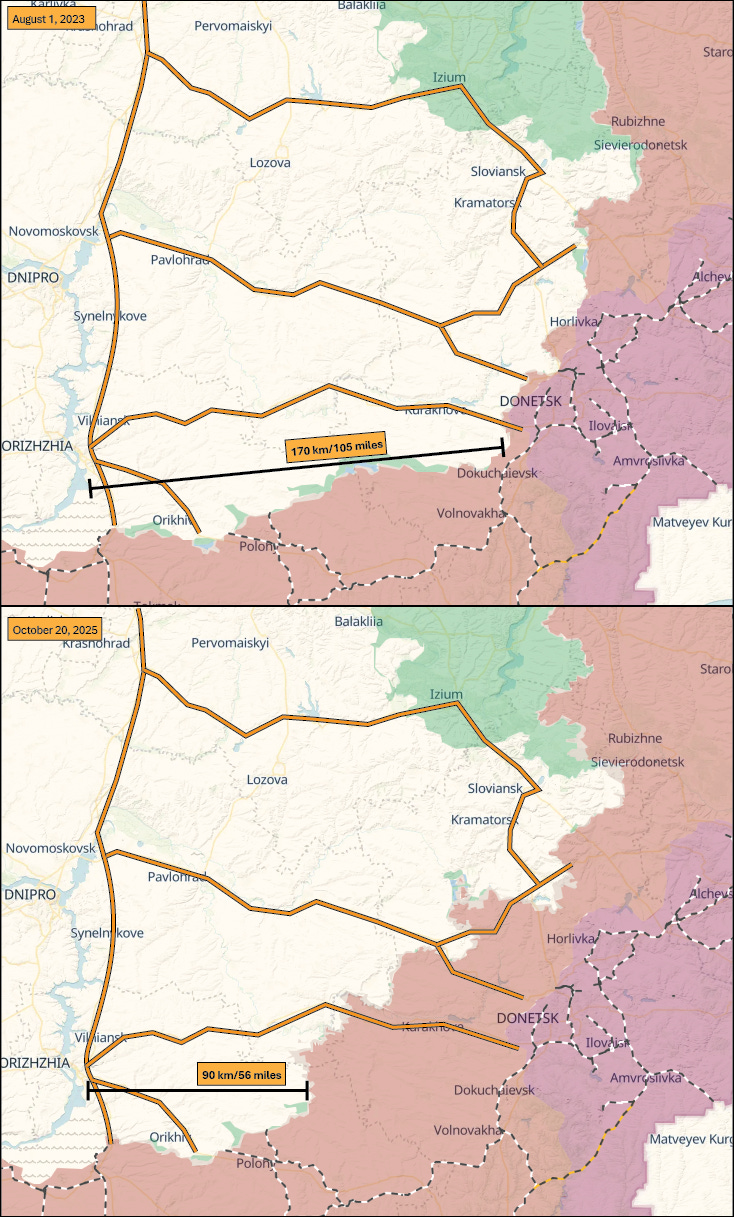 Para empezar, consideremos el progreso que Rusia ha logrado en el sur de Donetsk, tanto en términos territoriales como en sus implicaciones para la conectividad logística ucraniana. Para demostrarlo, he obtenido mapas de DeepState (una empresa cartográfica ucraniana) de agosto de 2023 (cuando Ucrania intentaba su contraataque desde Orikhiv) y del 20 de octubre, la semana en que se escribe este artículo. He anotado la longitud del frente sur (obviamente, una aproximación lineal, ya que el frente real presenta muchas curvas y protuberancias) y he destacado las vías clave que Ucrania utiliza para gestionar la columna vertebral de su logística.