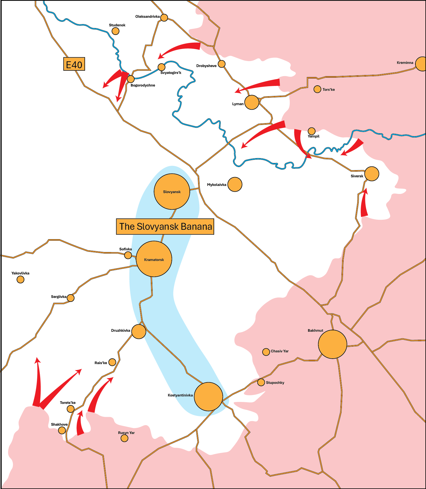 La E40 sigue la curva del Donets muy de cerca (generalmente se mantiene a menos de ocho kilómetros del río). Si los rusos mantienen su avance al norte del Donets y alcanzan el río en Bogorodychne o Svyatogirsk, no solo someterán a la E40 a un ataque persistente con drones, sino que también curvarán la línea defensiva tras el río Banana, por no hablar de la enorme presión sobre el saliente de Siversk.