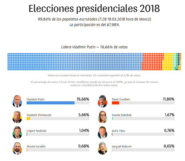 Con el 98,92% escrutado, Putin cosecha el histórico 76,66% de los apoyos en los comicios dejando muy atrás a los restantes siete aspirantes que compitieron con él por la presidencia rusa.