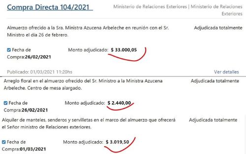 A los $33.000 de la comida, se agrega el arreglo floral ("centro de mesa alargado"), que tuvo un costo de $ 2.440, en tanto que el alquiler de "manteles, senderos y servilletas" ascendió a $ 3.019,50 ($274,50 por comensal).
