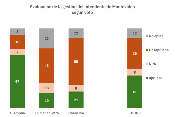 Al igual que lo que sucede con la evaluación de la gestión del presidente Orsi, las opiniones están muy polarizadas políticamente. Entre los votantes del Frente Amplio, 67% aprueba y solo 18% desaprueba la gestión de Bergara, mientras que entre los votantes de la Coalición 59% desaprueba y 21% aprueba.