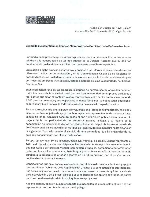 En una carta dirigida a la Comisión de Defensa Nacional del Parlamento, la Asociación Clúster del Naval Gallego (Aclunaga) se ofreció como mediadora entre el Estado uruguayo y el astillero Cardama, encargado de la construcción de dos patrulleras oceánicas.