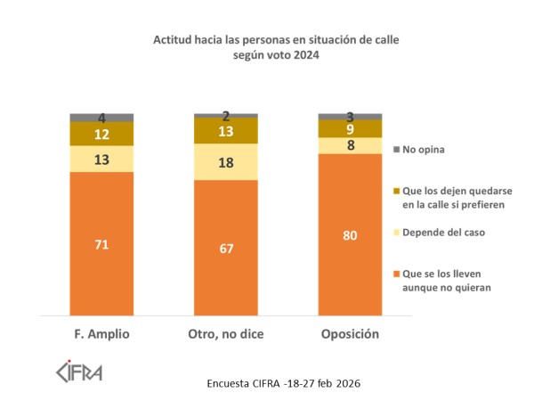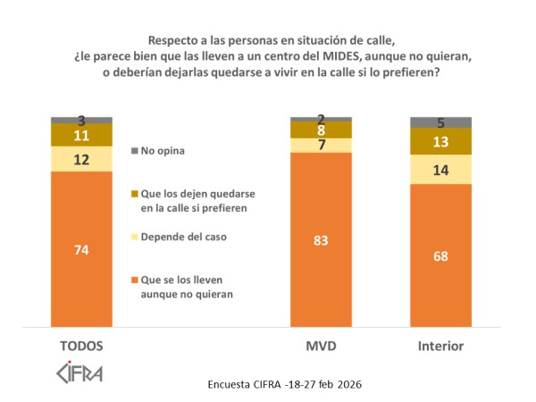 ¿Qué opina la población? De acuerdo a una encuesta realizada por la consultora Cifra entre el 18 y el 27 de febrero, divulgada en Telemundo, el 74% aprueba que se lleve a personas en situación de calle a un centro del Mides, incluso contra su voluntad, mientras que apenas 11% piensa que es mejor que los dejen quedarse a vivir en la calle si lo prefieren.