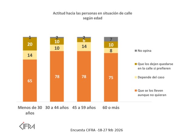 En el único grupo en el que se registra una minoría de peso (un quinto) a favor de dejar que la gente en situación de calle siga en la calle si lo prefiere es entre los más jóvenes. Sin embargo, incluso entre estos, la gran mayoría (dos tercios) apoya la internación compulsiva.