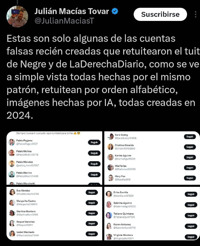 Estas mismas cuentas amplifican contenido vinculado, entre otros, al portal La Derecha Diario, con el que desde hace dos meses el español Javier Negre se ha dedicado a publicar información falsa o descontextualizada sobre figuras de la oposición y movimientos sociales.