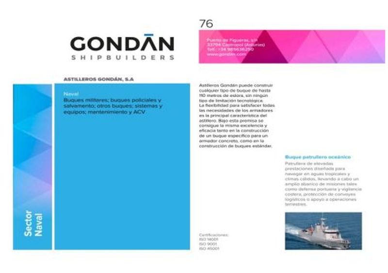 La fecha de emisión de dicha nota, corresponde exactamente con la de este Catálogo, 2023-2024, así que además de recurrir a la web de la propia empresa, a una búsqueda, incluso superficial en Internet, la Embajada tenía a su disposición nada menos que este Catálogo, donde aparecen diversos astilleros españoles de renombre en el país y a nivel internacional especializados especialmente en ese tipo de patrulla oceánicas.