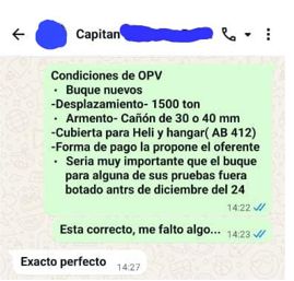 20/04/23. Las empresas que venían presentándose desde siempre, comienzan a recibir mensajes de Whatsapp (Imag.2) de la Ayudantía del Comandante en Jefe, solicitándoles NUEVA COTIZACIÓN DE OPVs, de otras características, más económicas... Y una condición que llamaba la atención: que la primera OPV se recibiera en diciembre del 2024...