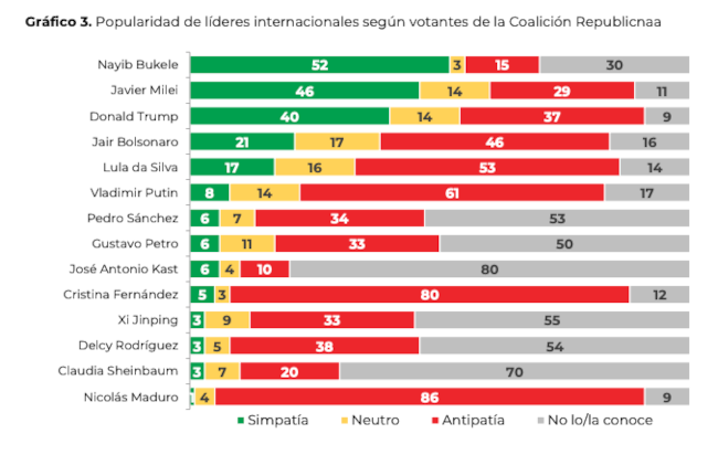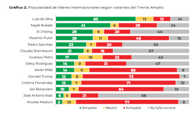 Otros líderes globales y regionales reciben tanto o más rechazo que Trump. Es el caso de Nicolás Maduro y Cristina Fernández de Kirchner (fuertemente rechazados en ambos bloques políticos), pero también de Vladimir Putin o Jair Bolsonaro (en este caso más atravesados por el voto de los uruguayos).