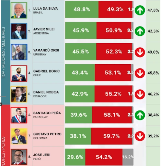 Este mes Lula da Silva lidera el ranking con un 48,8% de imagen positiva, en segundo lugar está Milei con un 45,9% a su favor y en tercer lugar está Orsi con un 45,5% de aprobación.