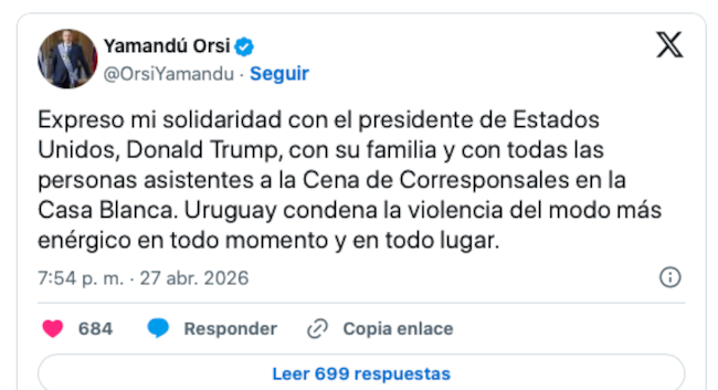 Orsi expresó su solidaridad con Trump, su familia y "con todas las personas asistentes a la Cena de Corresponsales en la Casa Blanca", y aseguró que "Uruguay condena la violencia del modo más enérgico en todo momento y en todo lugar".