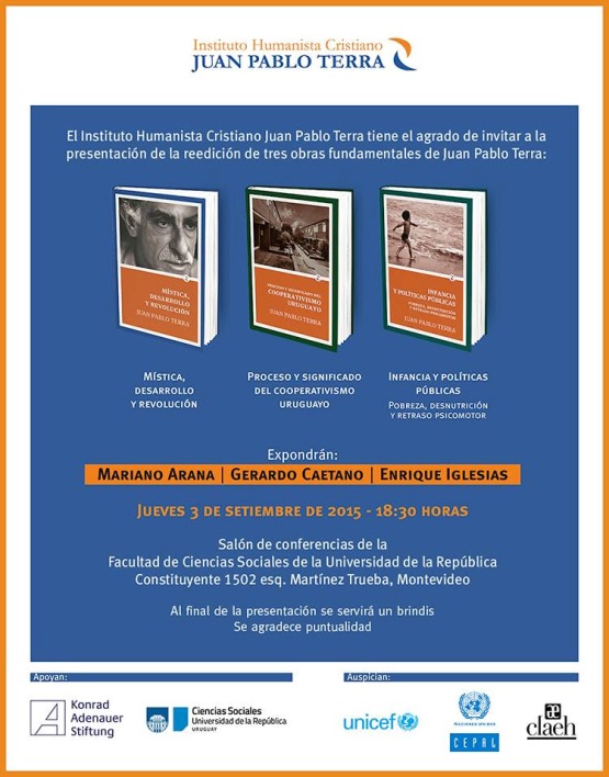 Con el apoyo de la Fundación Konrad Adenauer y la Facultad de Ciencias Sociales de la UdelaR, el Instituto Humanista Cristiano Juan Pablo Terra presentará este jueves se presentarán tres obras fundamentales del Arq. Juan Pablo Terra: